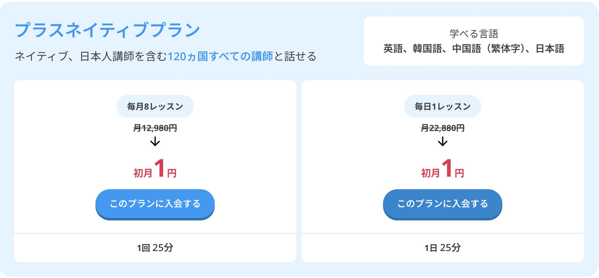 DMM英会話|プラスネイティブプラン 料金表(2025年8月)