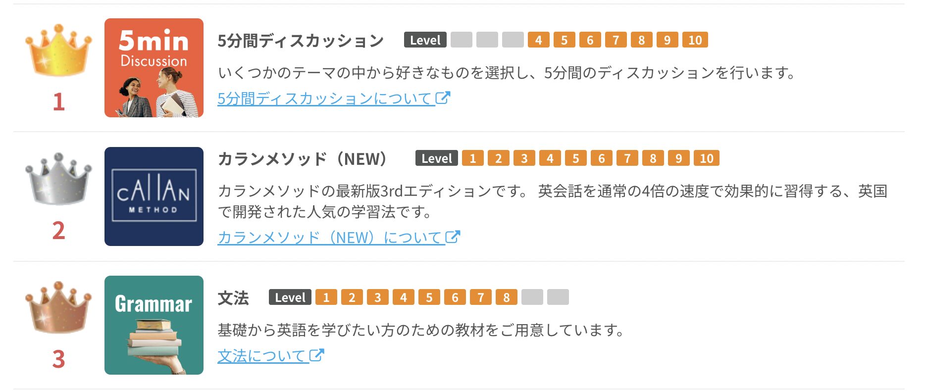 - 教材約5,000種類/7カテゴリー(日常・ビジネス・文法・発音など)