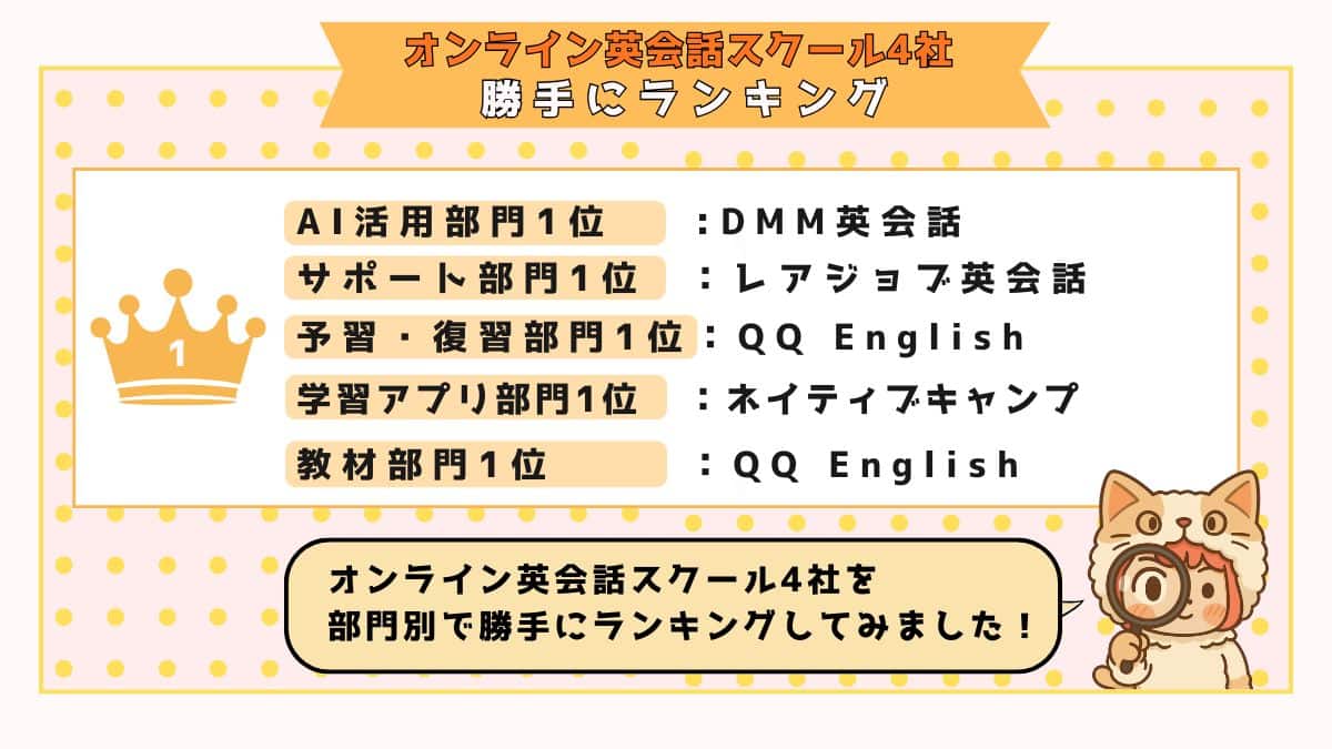 比較対象は DMM英会話・ネイティブキャンプ・レアジョブ英会話・QQ English の4社です。