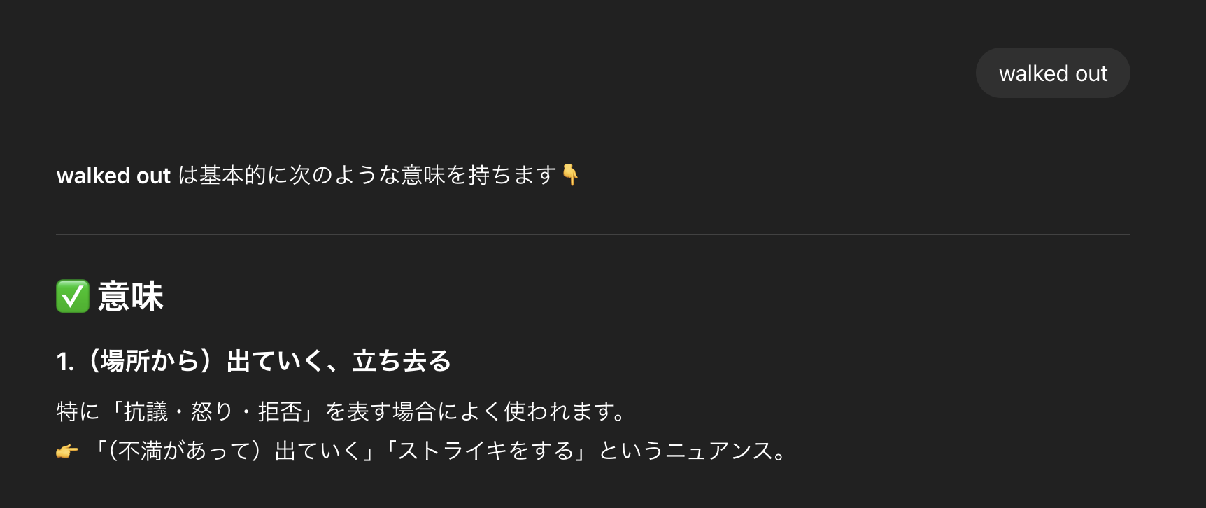 たとえば「walked out」という英熟語を質問すると、単に「出て行った」と訳すのではなく、その英文内での使われ方を踏まえて解説してくれます。