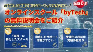 AIトレンド・コラム 【体験レポ】副業初心者におすすめ?byTech(バイテック)無料説明会に参加してみました 副業初心者におすすめのオンラインスクール「byTech」無料説明会を体験レポート。AIスキル習得から案件獲得までの流れや料金・サポート内容を詳しく解説します。 2025.10.04 AIトレンド・コラム